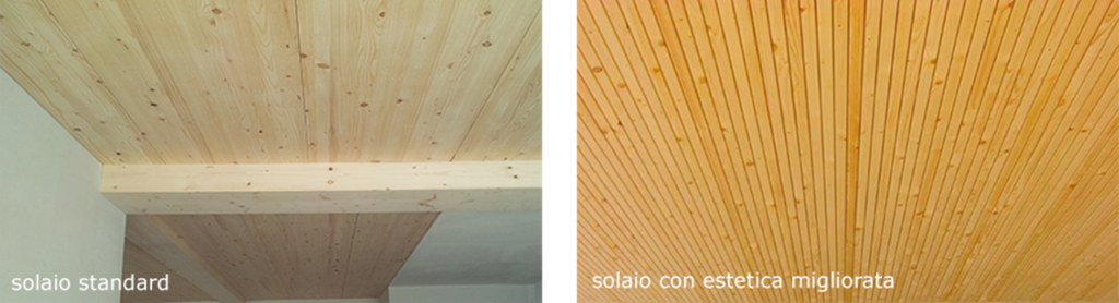 Il solaio a travi è formato da legni in abete bilama coperti da un tavolato maschio-femmina di spessore 32 mm, che funge da piano di calpestio.